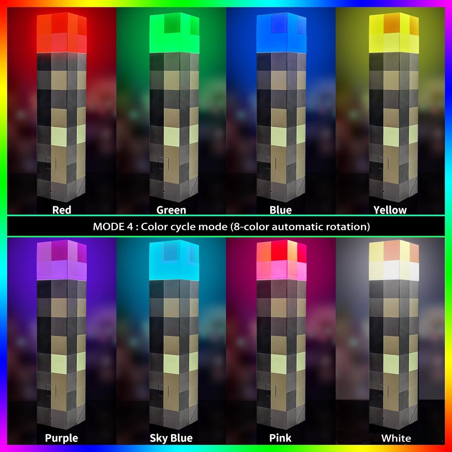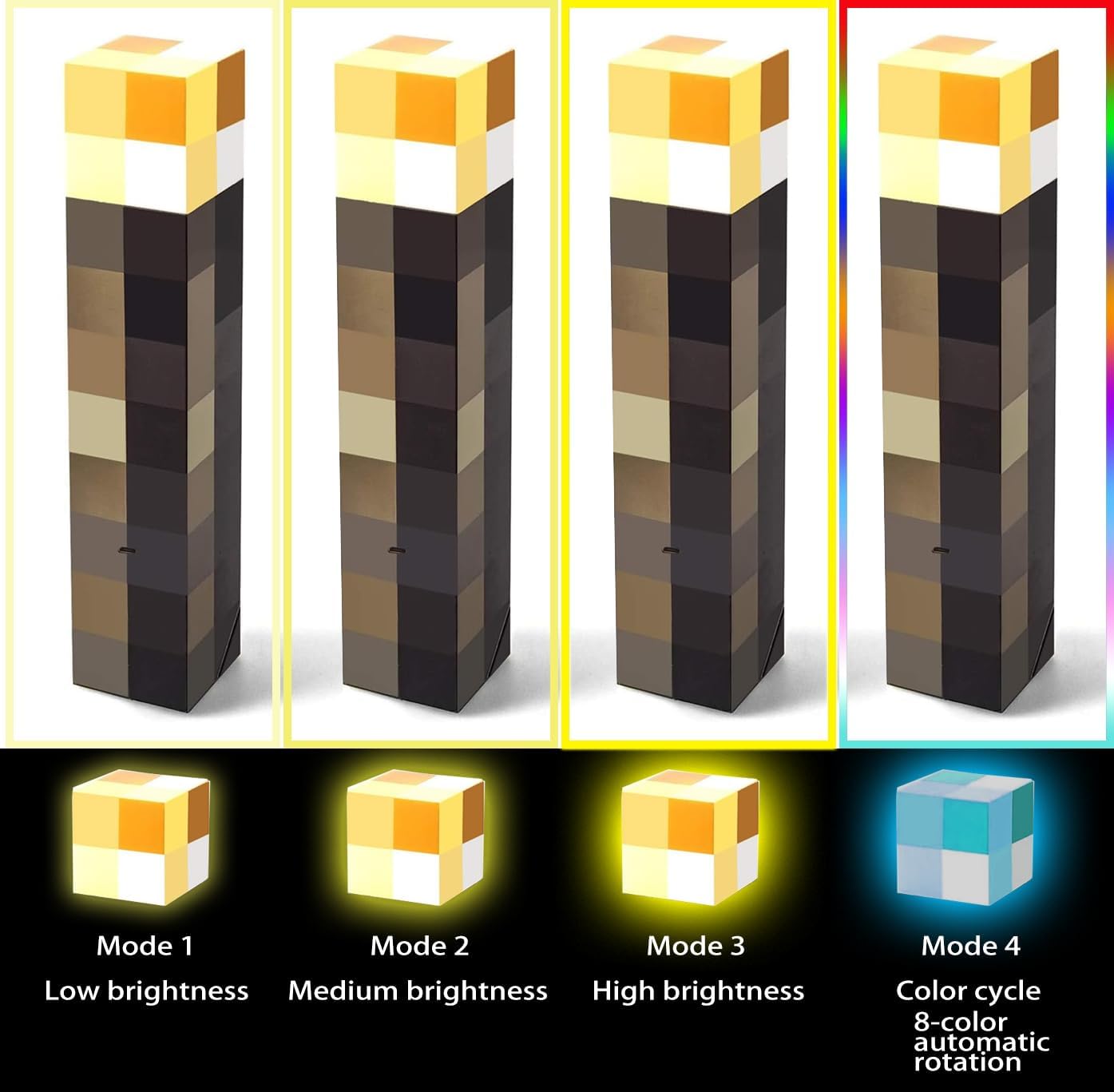 Authentic Design: Modeled after the classic torch from your favorite block-building game, featuring a pixelated texture and a glowing yellow light at the tip.